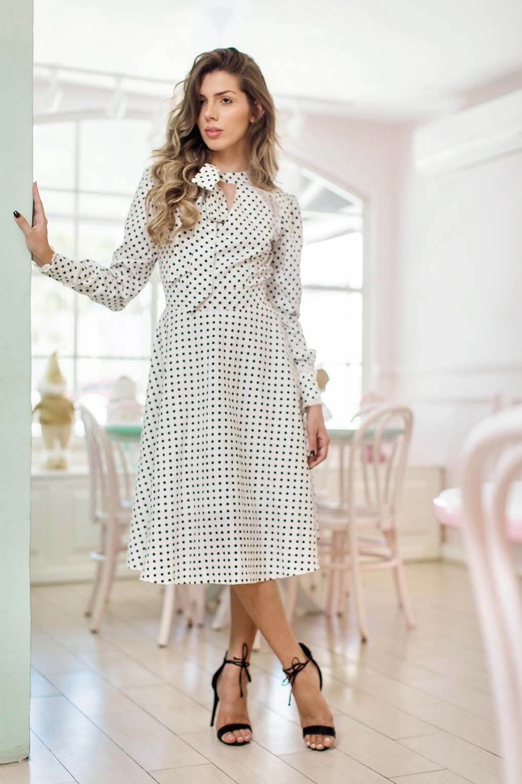 The bodice of the dress is slightly fitted, while puffed sleeves, a cinched waist and flowing A-line skirt add volume for a flattering fit. In addition to the allover white with black polka dots design, a large bow sits at the neck, buttons secure the cuffs, and lace accents decorate the cuffs and shoulders for delicate touches.